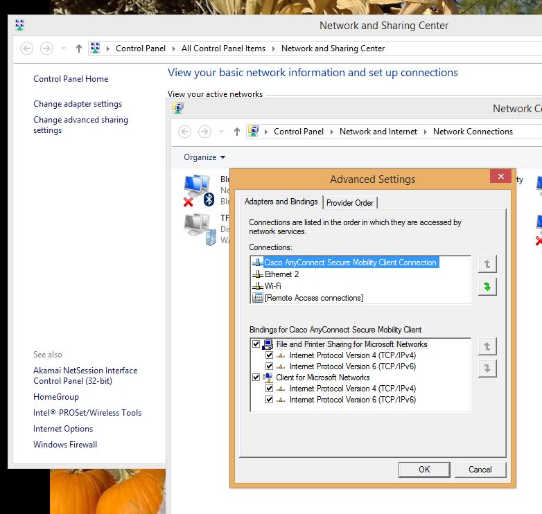 Hidden in the Network and Sharing Center is a setting that allows you to prioritize the network connections. Mac’s make it easier in the Network system preferences screen. You can move the connection up or down on the main screen. Microsoft has buried this setting.